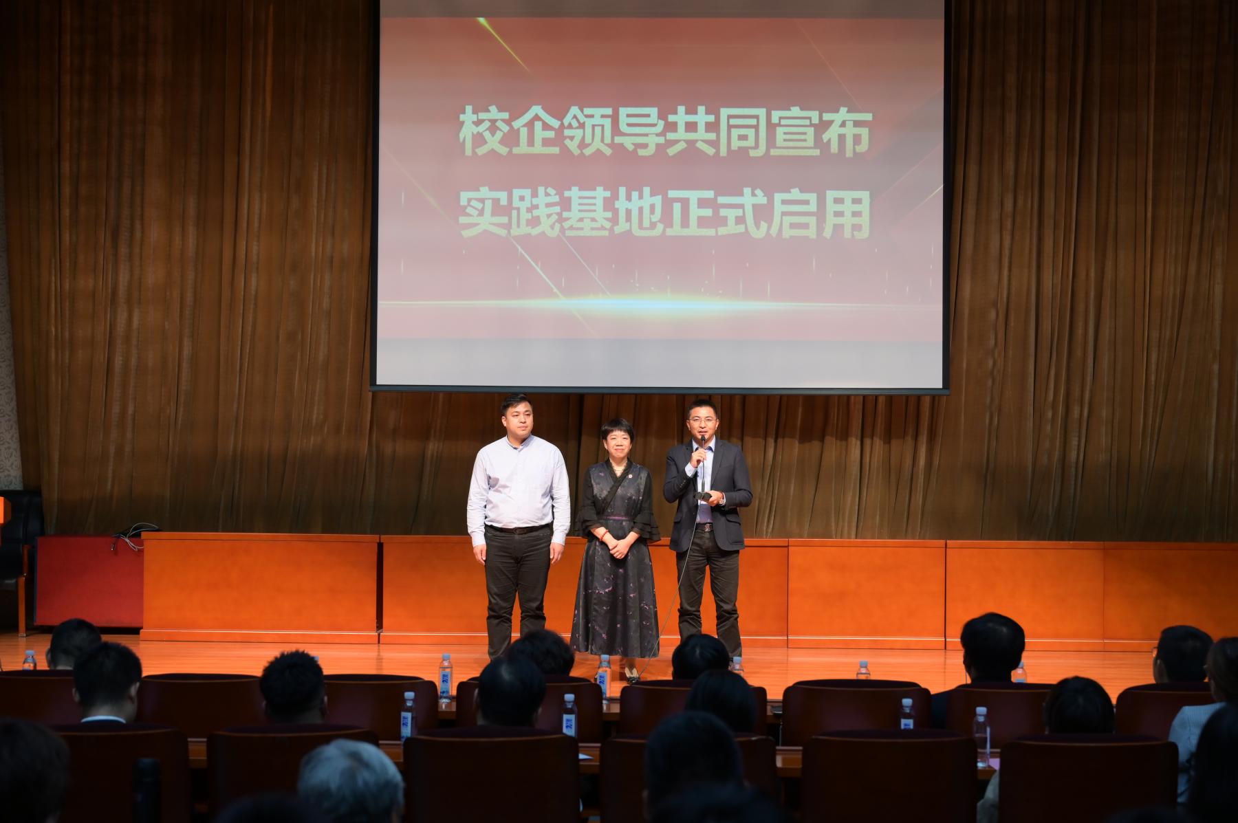 京东物流科技副总裁范广辉,校园馆联合创始人张前程,与副校长张旭凤教授三位校企领导共同宣布实践基地正式启用。